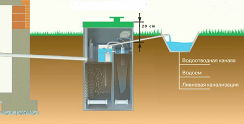 Септик Топас с самотечным отводом сливает воду из бака, после окончательного этапа очистки. Отводная труба устанавливается под наклоном в сторону точки сброса. Такой вариант, подойдет дачным участкам, где есть дренажный колодец, овраг, склон с обрывом.